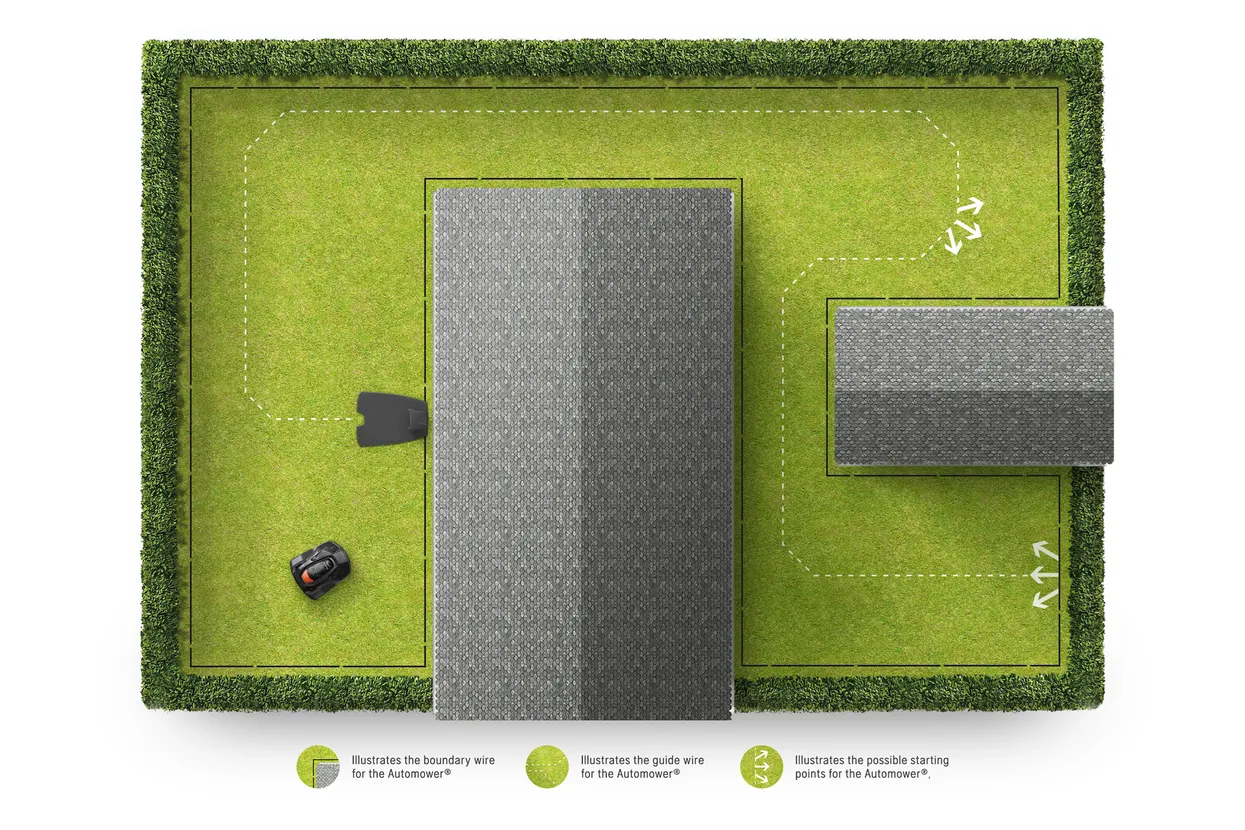 Dacă gazonul tău are două zone care nu sunt conectate printr-un pasaj de trecere pentru mașina de tuns gazon, de exemplu gazonul din fața casei și cel din spate, atunci poți crea o zonă secundară în cadrul instalației. Odată instalată, va fi nevie să muți manual mașina de tuns gazon între aceste două zone, iar robotul va lucra conform duratei selectate sau până când se descarcă bateria.