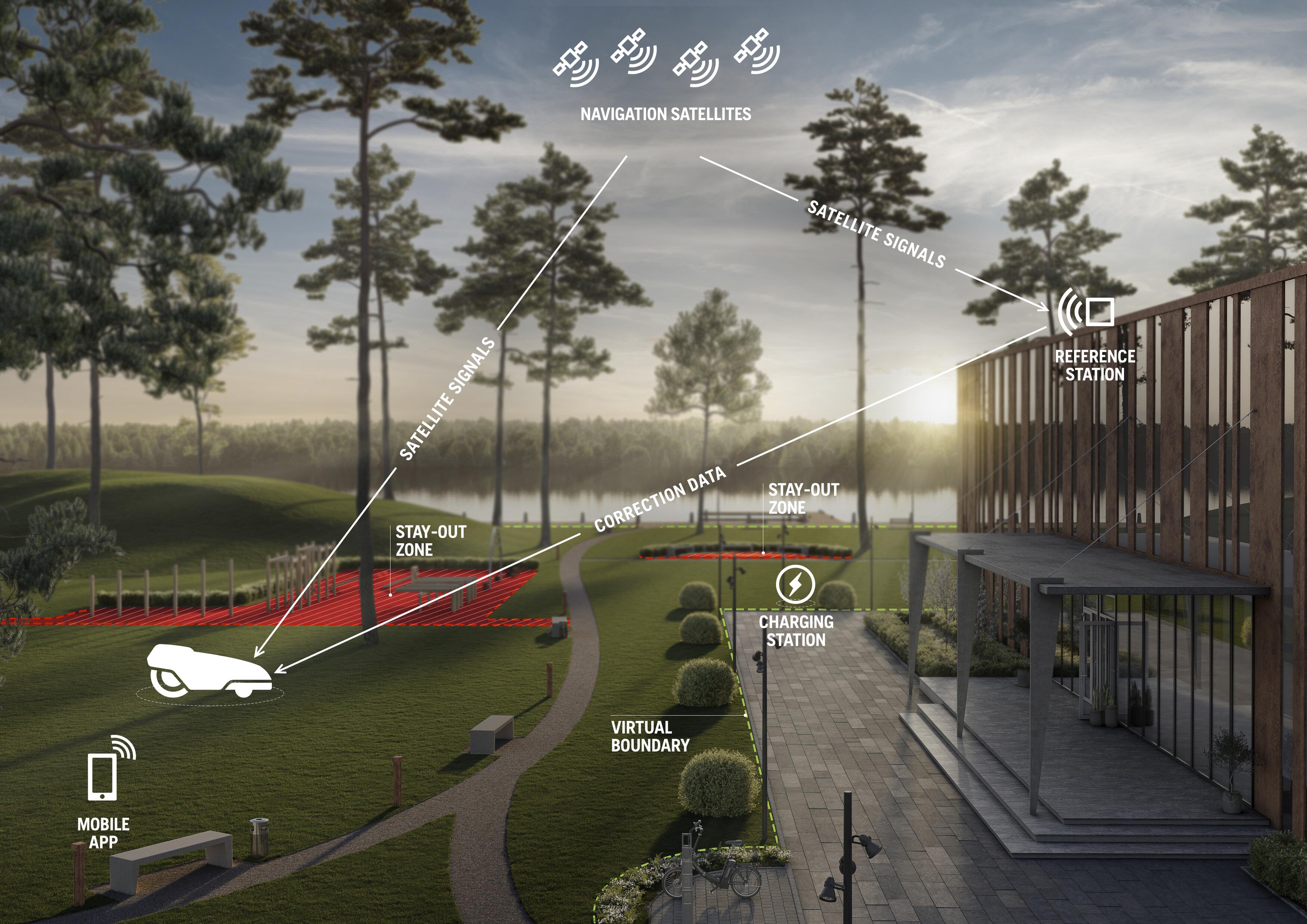Funcționarea virtuală, fără fir prin tehnologia RTK-GNSS bazată pe satelit, permite o precizie de până la aproximativ 2 cm. Absența cablurilor fizice implică un nou nivel de robustețe și flexibilitate, permițând aerarea regulată în adâncime și repararea gazonului fără a pune în pericol funcționarea instalației robotului.