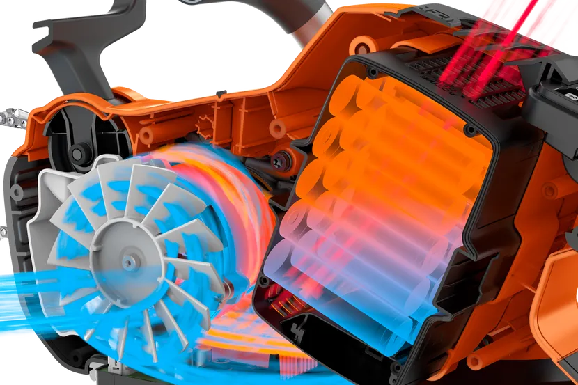 Husqvarna ActiveCool enables efficient cooling of the battery, both during charching and discharging. Thanks to the active cooling system the batteries are recharged quickly after use, while the lifetime of your batteries prolongs.