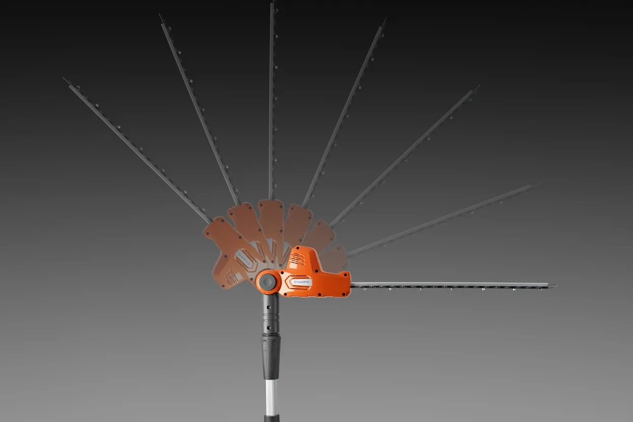 Masă de tăiere articulată pentru versatilitate sporită și muncă mai puțin obositoare. Reglabilă în 7 unghiuri pentru o poziție de tăiere convenabilă atunci când tăiați din lateral, din unghiuri asimetrice, zone inaccesibile sau garduri vii cu înălțimi diferite.